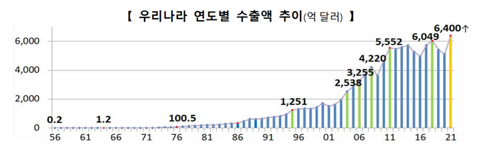 우리 수출은 1964년 첫 수출 1억 달러를 달성한 이후 1977년 100억 달러, 1995년 1000억 달러, 2018년 6000억 달러를 넘어선 데 이어 2021년에 연간 수출액 최고 기록을 달성했다.