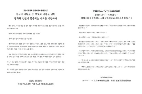 단과 평화·인권존중을 바탕으로 진실에 입각한 정론직필을 촉구하는 '한일 양국 언론노동자 공동선언'을 채택했다.