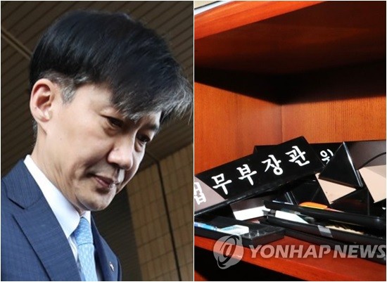 ▲ 조국 전 장관(왼쪽). 오른쪽은 김오수 법무부 차관이 15일 오전 열린 국회 법제사법위원회의 법무부, 대한법률구조공단, 한국법무보호복지공단, 정부법무공단 등 국정감사에서 선서할 당시 오른쪽 단상 아래에 있던 법무부 장관 명패. 연합뉴스 제공 |