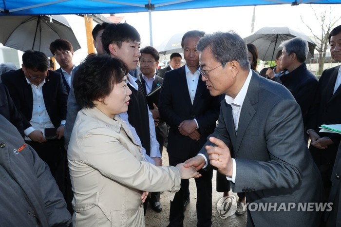 문재인 대통령이 지난 4월 26일 오전 강원도 고성군 토성면 성천리 마을 산불피해 복구현장을 방문해 산불 진화에 참여했던 공무원을 격려하고 있다.