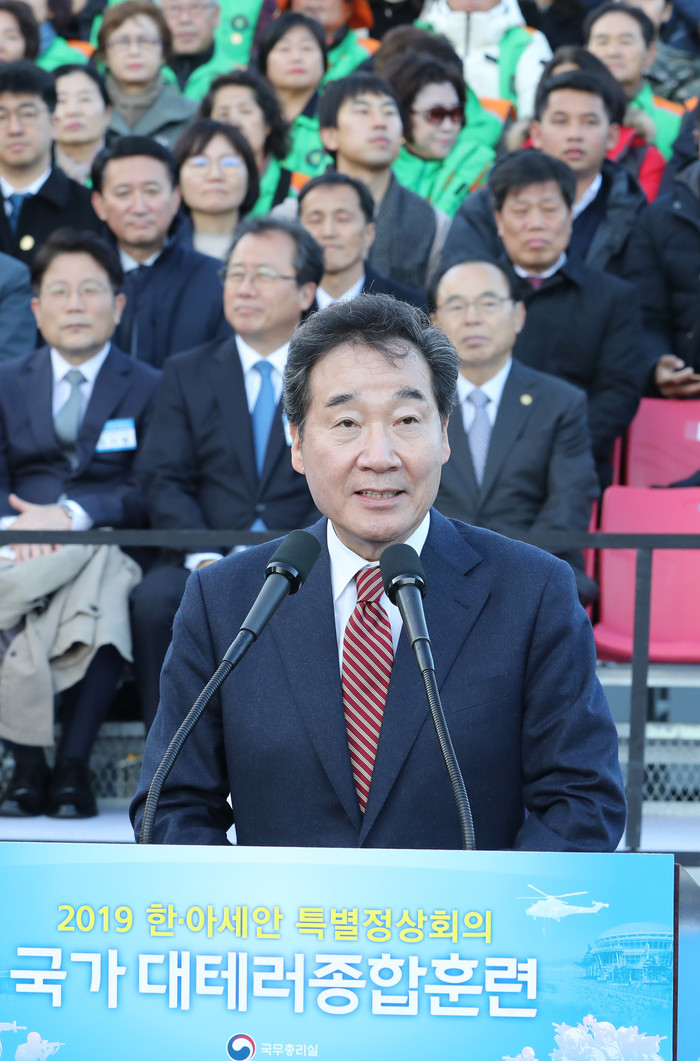 이낙연 국무총리가 지난 21일 오후 부산 해운대 벡스코에서 열린 '2019 국가 대테러종합훈련'에 참석해 격려사하는 모습. 2019.11.21