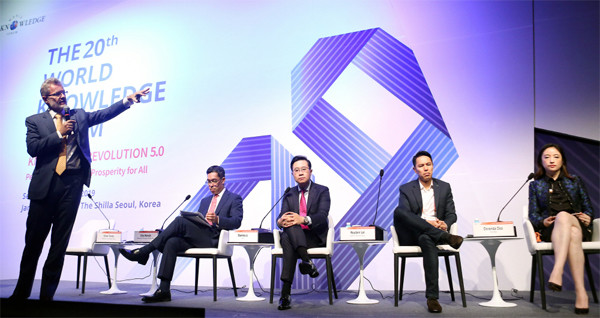 26일 서울 중구 신라호텔에서 열린 `제20회 세계지식포럼`에 모인 루벤 라이 그랩파이낸셜 대표, 스탠리 리 DXY 회장, 두 도란다 아이플라이텍 수석부사장은 자신들이 이끌고 있는 정보기술(IT) 기업이 어떻게 아시아를 진보시키고 있는지 공유하고, 각국 기업 간 시너지 효과를 극대화하기 위한 방안을 모색했다.