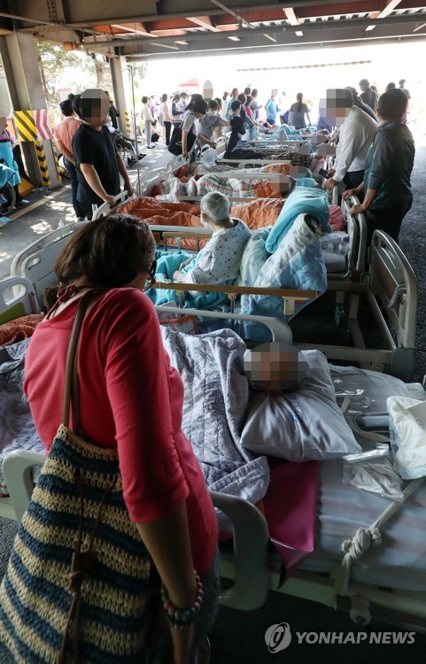 화재 직후 환자 130여명이 긴급 대피한 병원 1층 주차장에는 하얀 병상이 발 디딜 틈 없이 놓였고 매캐한 냄새가 맴돌았다.