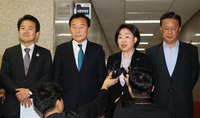 ▲ 민주당과의 선거법 협상을 앞두고 '연동형캡 수용·석패율제 도입'의 단일안을 마련한 민주평화당 정동영(왼쪽부터), 바른미래당 손학규, 정의당 심상정, 대안신당 유성엽 대표가 18일 국회에서 합의 결과를 설명하고 있다. 연합뉴스 제공