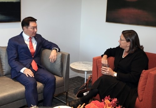 'SK의 밤' 행사에서 캐런 켈리 미 상무차관 대화하는 최태원 SK 그룹 회장/연합