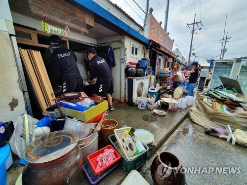 ▲ 태풍 '미탁'으로 많은 침수 피해가 발생한 강릉 경포호수 주변 진안상가 상인들이 4일 봉사활동 나온 군장병과 복구작업을 벌이고 있다.