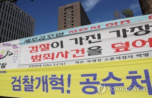 조국 법무부 장관이 전격적으로 사퇴한 14일 오후 서울 서초구 서울중앙지검 정문 인근에 검찰개혁을 요구하는 현수막이 설치돼 있다. |