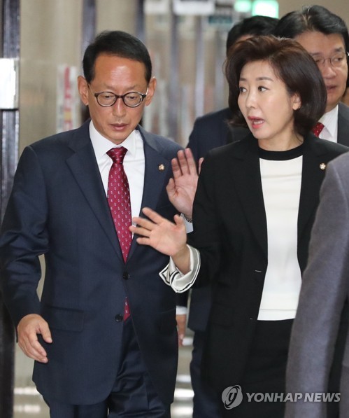 자유한국당 나경원 원내대표와 법사위 간사인 김도읍 의원이 14일 오전 굳은 표정으로 국회에서 열린 최고위원회의에 들어서고 있다. |