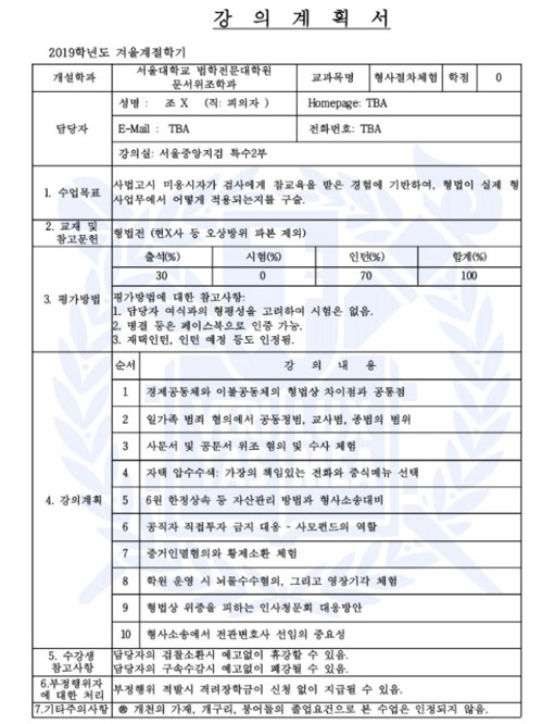 서울대 동문 온라인 커뮤니티인 '스누라이프'에는 조 전 장관이 개설한 것처럼 꾸민 '강의계획서'도 등장했다.