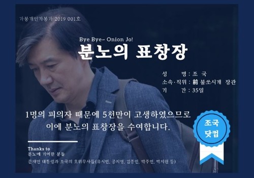 이들 단체는 조 전 장관의 소속·직위를 '() 불쏘시개 장관'이라고 적고 "피의자 한 명 때문에 5000만 명이 고생했으므로 분노의 표창장을 수여한다고 기재했다. 또 유시민 노무현재단 이사장과 공지영 작가, 일부 국회의원들을 조국의 호위무사라고 표현했다.
