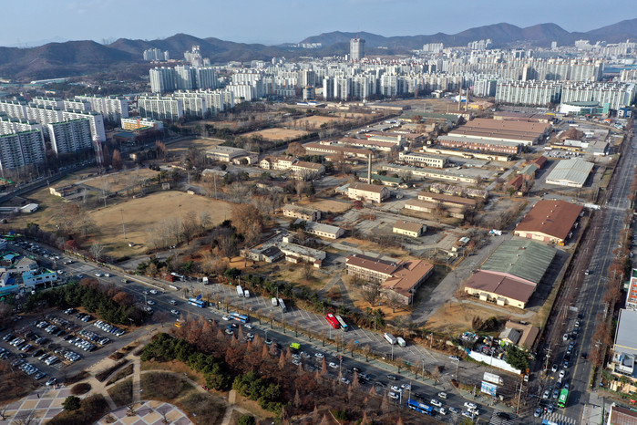 정부가 원주, 부평, 동두천에 있는 4개의 미군기지를 반환받는다고 발표한 11일 오후 인천시 부평구 미군기지 캠프마켓 일대가 아파트에 둘러싸여 있다. [연합뉴스 제공] |