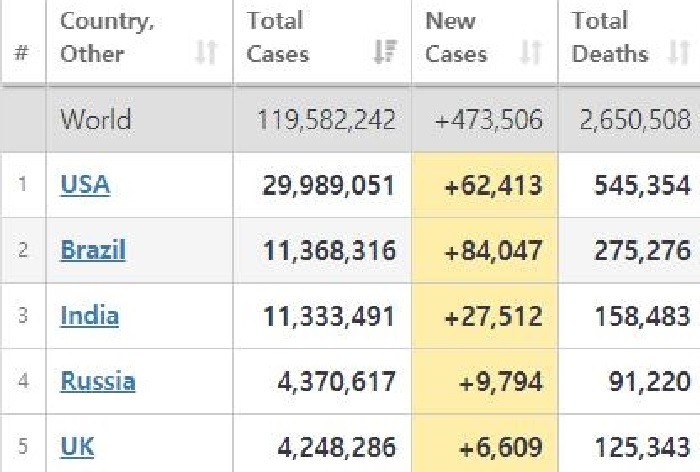 [아시아뉴스 = 이창우 기자] 신종 코로나바이러스 감염증(코로나19)에 대한 '3차 대유행' 우려가 커지고 있는 가운데 인도의 코로나19 확진자 수가 크게 줄어들면서 누적 확진자수 순위가 뒤바뀐 것으로 파악됐다. 기존 미국과 인도, 브라질 순이었지만 브라질의 확산세와 인도의 감소세가 엇갈리면서 순위가 바뀌었다.