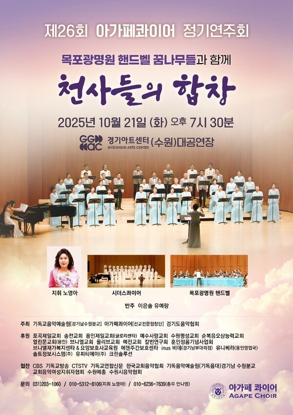아가페콰이어(지휘 노영아 교수)가 오는 10월 21일(화) 오후 7시 30분, 경기아트센터 대공연장(수원)에서 제26회 정기연주회 “천사들의 합창”을 개최한다. 이번 연주회는 목포광명원 핸드벨팀 ‘꿈나무들’이 함께하며, 가을밤을 아름답게 수놓을 천상의 하모니를 선사할 예정이다.