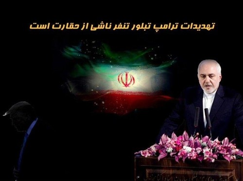 ▲ 이란 외무부가 트위터에 게시한 모하마드 자바드 자리프 외무장관의 사진. '트럼프는 굴욕과 이란에 대한 증오로 이란을 협박한다'라는 문장이 적혔다. 출처 이란 외무부 트위터