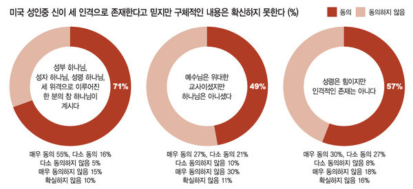 미국인의 3분의 2 이상(68%)은 하나님이 변하지 않는다고 말하지만, 이들의 신학적 관점이 항상 일관된 것은 아니었다. 10명 중 7명(71%)은 성부 하나님, 성자 예수 그리스도, 성령 하나님이라는 삼위일체의 한 분 하나님이 존재한다고 동의했다. 그러나 많은 미국인들은 그 믿음의 논리적 결론에는 어려움을 겪고 있다. 대부분(57%)은 성령을 인격적 존재가 아니라 힘(force)으로 본다. 4분의 1(26%)은 이에 동의하지 않았다. 복음주의 교단에 소속된 응답자와 복음주의 신앙을 갖고 있는 응답자는 이에 반대할 가능성이 가장 높았다.