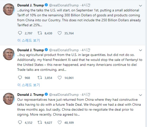 트럼프 대통령이 미중 무역협상을 빨리 타결하기 위해 추가 관세부과라는 초강수를 둔 셈이다.
