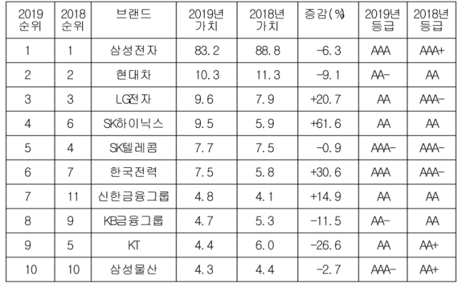 [표] 2019년 한국 브랜드 가치 50대 기업 중 상위 10개
