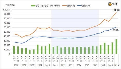 26일 부동산정보서비스 직방이 국토교통부 실거래 가격을 분석한 결과에 따르면 2011∼2016년 두 지역 간 가격 차는 1억5천만∼1억7천만원이었다가 2017년 상반기부터 한강 이남의 아파트 평균 가격이 가파르게 상승하며 격차가 2억원 이상 벌어지고 있다.